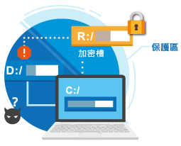 針對使用者本機端架構虛擬磁碟保護(R槽),勒索軟體無法讀寫及破壞存放至虛擬磁碟中的重要檔案。