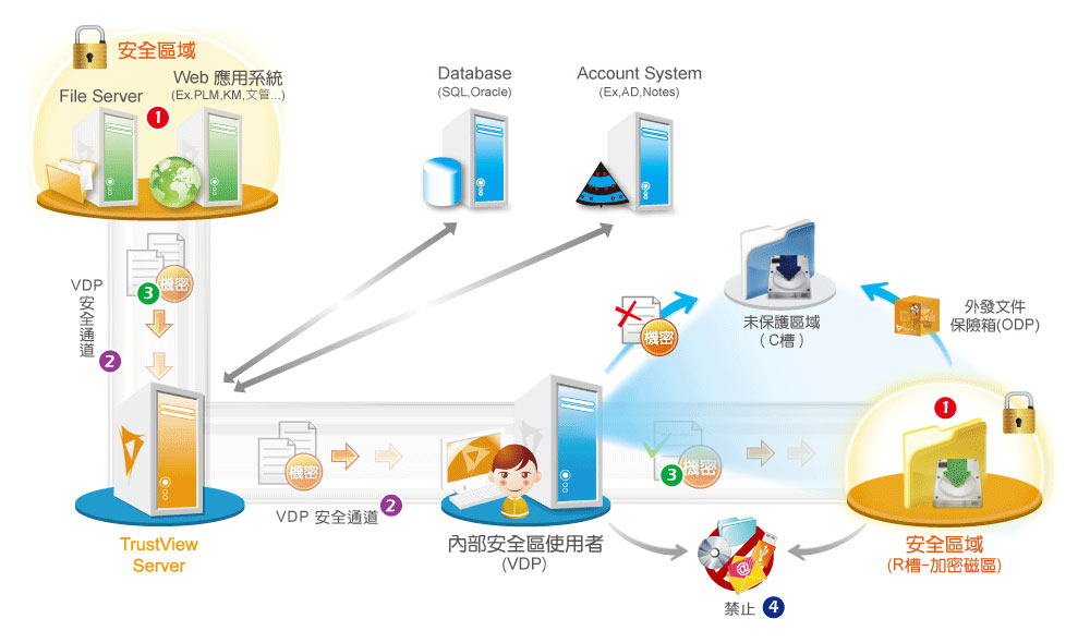 安全區內的文件資料如有外發需求,可搭配TrustView ODP,針對各種格式的外發檔案進行安全防護。