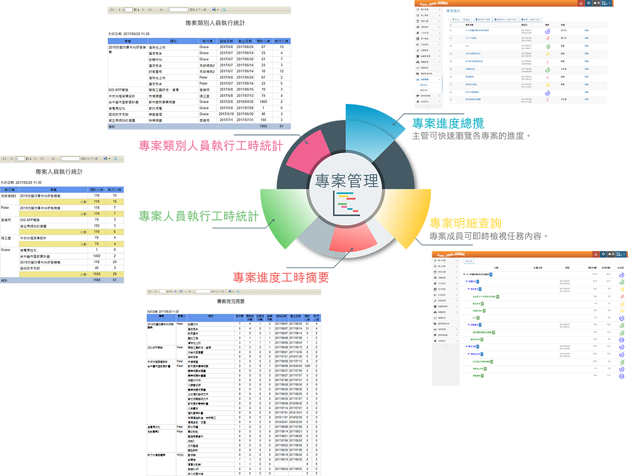 專案管理模組,畫面簡潔操作容易,非熟悉資訊系統之高層主管等都可以輕鬆查詢,看過一次就上手,最適合中小企業主或管理者使用!